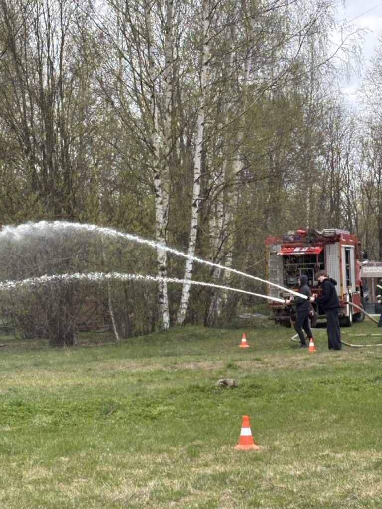 Ребята соревновались в одевании боевой одежды пожарного на скорость, прокладывании пожарной рукавной линии, подъеме по штурмовой лестнице на второй этаж учебной башни, а также в тушении условного очага пожара.